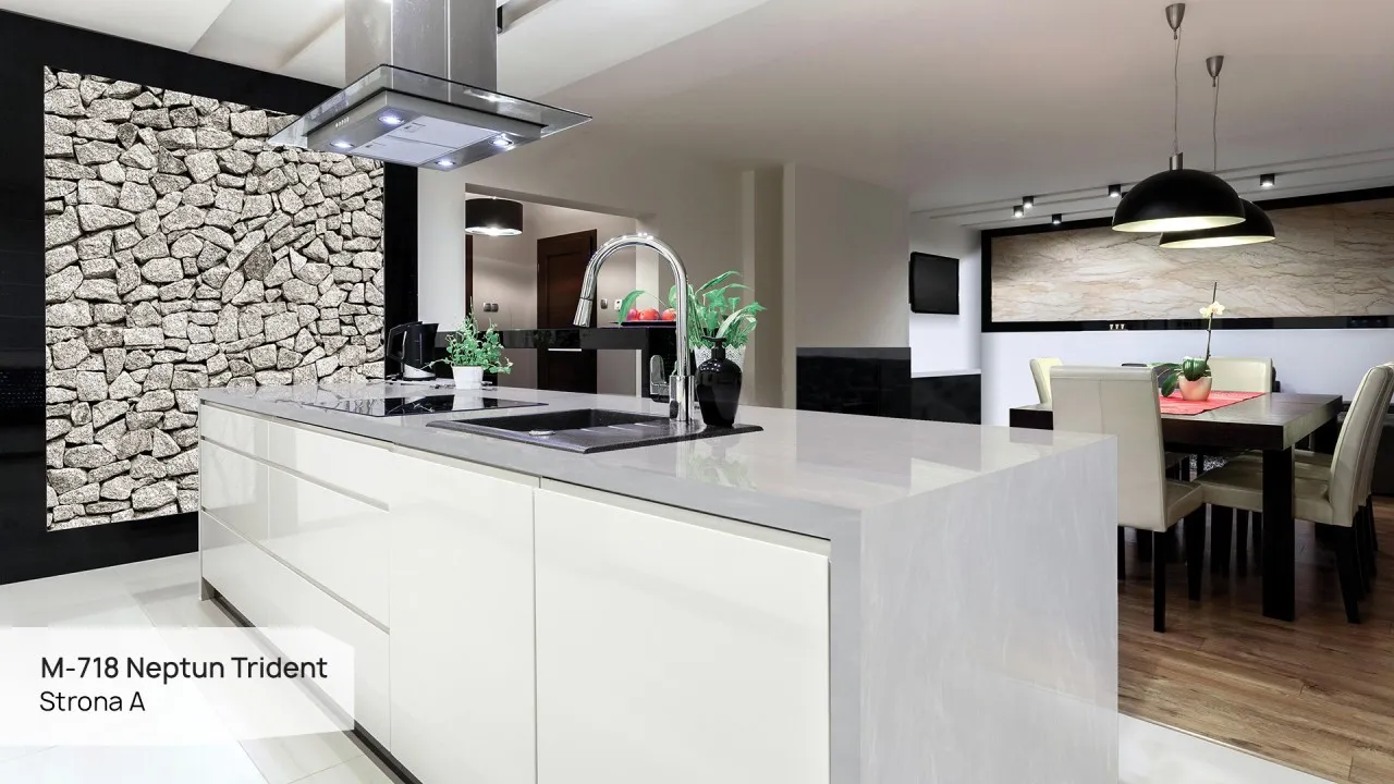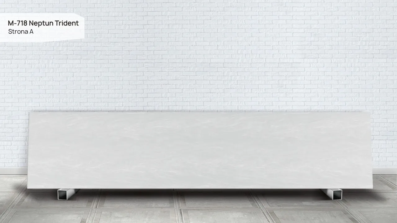 Blat Neptun Trident to propozycja, która doskonale odzwierciedla piękno naturalnych materiałów. Jego śnieżnobiała powierzchnia z delikatnym, szarym refleksem została wzbogacona o miękkie, nieregularne żyłki, które tworzą złudzenie płynących fal.