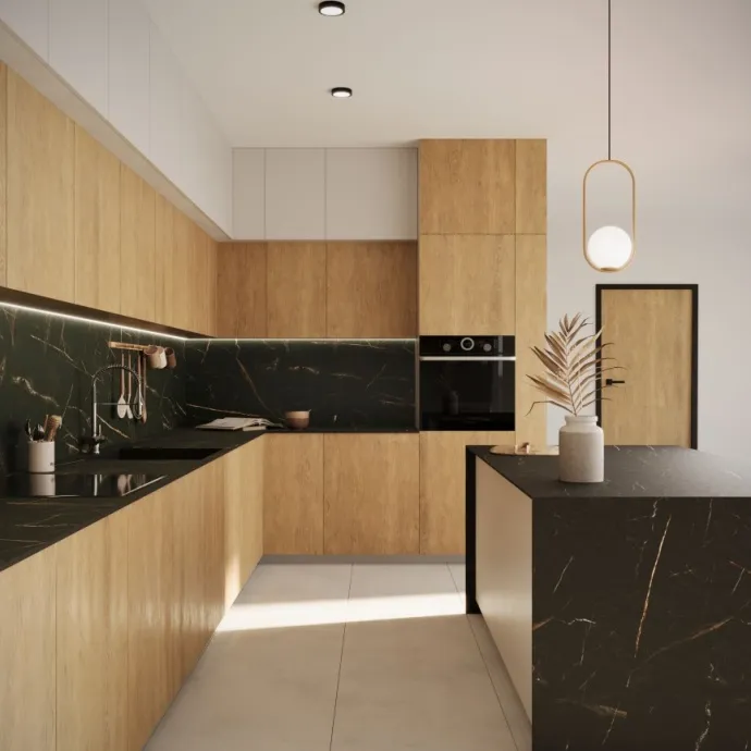 Blat kompaktowy Onyx Gold to efektowne połączenie głębokiej czerni z bogatymi, złotymi i beżowymi żyłami, tworzące dynamiczny i luksusowy efekt wizualny. Wyrazista kolorystyka inspirowana naturalnym onyksem podkreśla wyjątkowy charakter blatu, nadając przestrzeni prestiż i elegancję. Struktura blatu zapewnia nie tylko wizualne, ale również dotykowe wrażenie autentycznego kamienia. Onyx Gold to idealne rozwiązanie dla wnętrz, w których dominują wyrafinowanie i ekskluzywny styl.